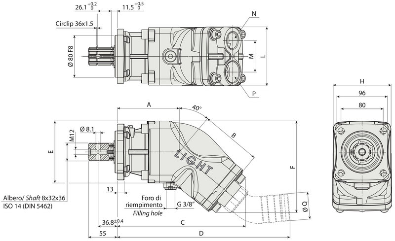 The suction and pressure ports are positioned on the rear side, with the possibility of changing the rotation direction by rotating the rear plate by 180°. The pump is equipped with a flange with 4 fixing holes and a DIN 5462 SE shaft.